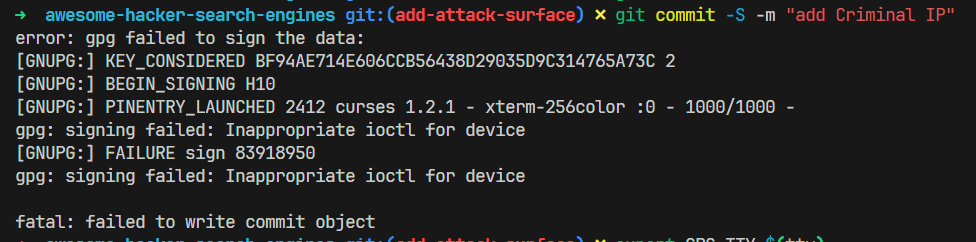 fatal: failed to write commit objectThe error is caused because GnuPG (GPG) can’t interact properly with the terminal (TTY) when it tries to prompt you for your passphrase to sign the commit.