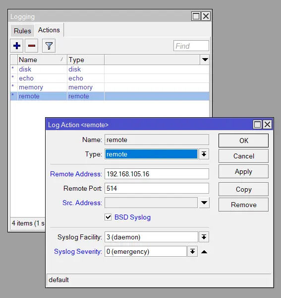 remote. Atau jika masih ingin menyimpan log di perangkat bisa membuat Rules yang sama namun Action diset kememory.