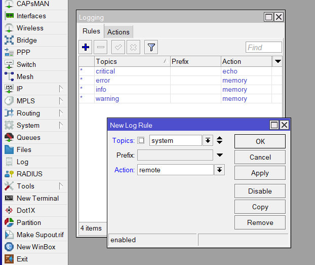 Klik pada System > Logging > Rules, lalu tambahkan Topics baru yaitusystemdan Action set keremote.