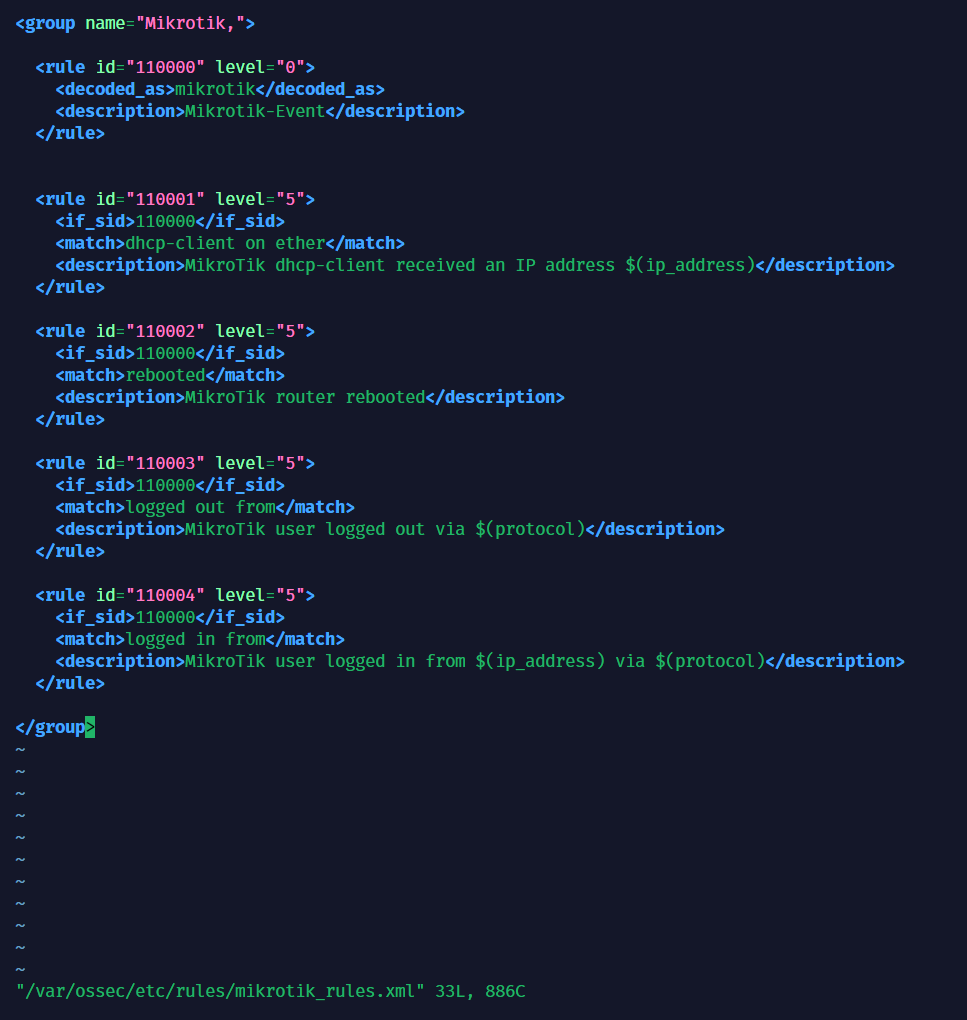sudo vim /var/ossec/etc/rules/mikrotik_rules.xml Isi dari file mikrotik_rules.xml