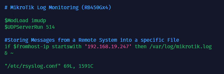 sudo vim /etc/rsyslog.conf Ganti <YOUR_MIKROTIK_IP_ADDRESS> dengan alamat IP perangkat MikroTik.